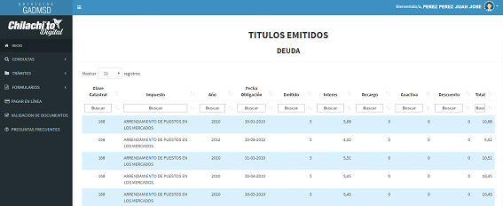Se desplegará un submenú, debe dar clic sobre el link “Deuda”, para poder visualizar una lista de los valores que adeuda al GAD Municipal Santo Domingo.