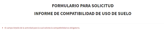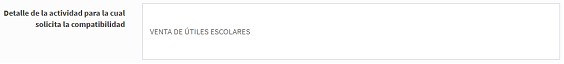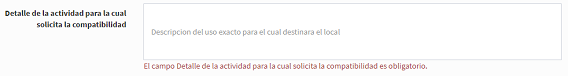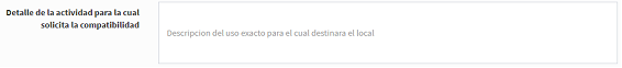 En el campo “Detalle de la actividad para la cual solicita la compatibilidad”, debe ingresar la descripción del uso exacto para el cual destinará el local.