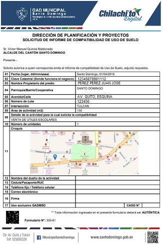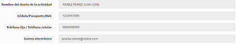 Finalmente, los campos “Nombre del dueño de la actividad”, “Cédula/Pasaporte/RUC”, “Teléfono fijo / Teléfono celular”, y “Correo electrónico”, se cargan automáticamente.