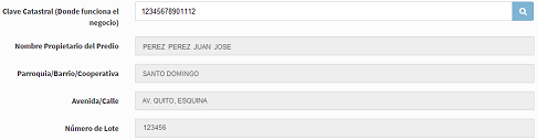 Si la clave catastral es correcta, se llenarán automáticamente los campos: “Nombre Propietario del Predio”, “Parroquia/Barrio/Cooperativa”, “Avenida/Calle”, “Número de Lote”, del lugar donde funciona el negocio.