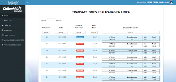 Se desplegará un submenú, debe dar clic sobre el link “Pagos en línea”, para poder visualizar una lista de los diferentes pagos realizados a través del Portal de Servicios del GAD Municipal Santo Domingo.