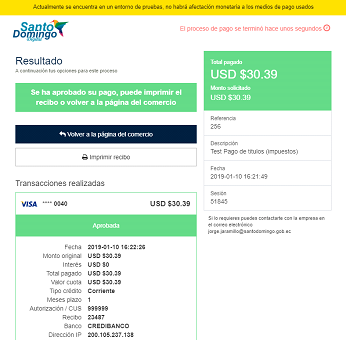 Para regresar a la página del GADMSD, debe dar clic en el botón “Volver a la página del comercio”.