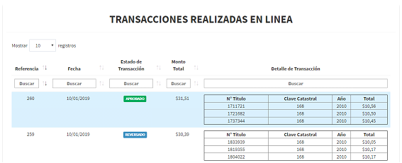 Podrá visualizar una lista de las transacciones en línea, realizadas y sus estados.