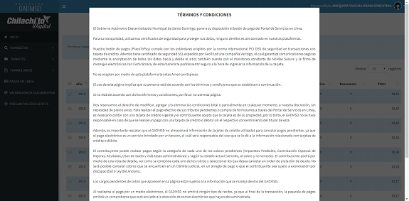 Antes de visualizar la página de Pagos en Línea, se mostrará la ventana de “Términos y Condiciones” para el Pago en Línea.