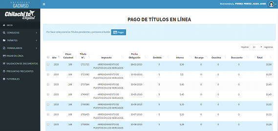 Podrá visualizar la página con una lista de los títulos de crédito que puede pagar en línea.