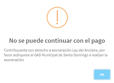 Si un contribuyente tiene derecho a exoneración (ley del anciano o discapacidad), no pude hacer el pago hasta que realice el proceso para descuento por exoneración en las oficinas del GADMSD.